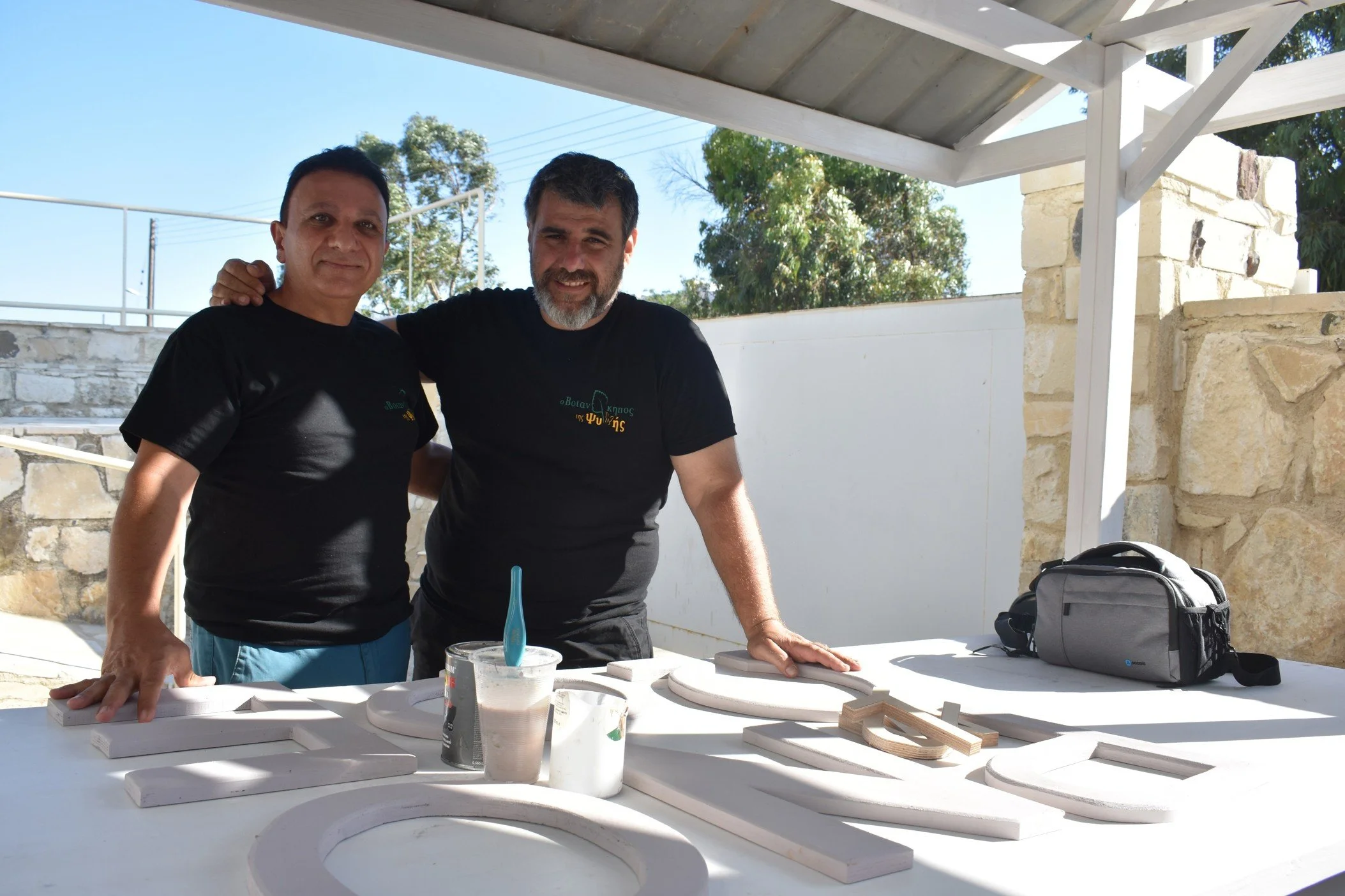 Αύγουστος 2017. Ο Δρ Τζάφερ Ποτίντσι και ο Δρ Κυριάκος Πλατρίτης εργάζονται μαζί για να κατασκευάσουν τις ξύλινες πινακίδες για το Μουσείο Medflora στη Λεμεσό.